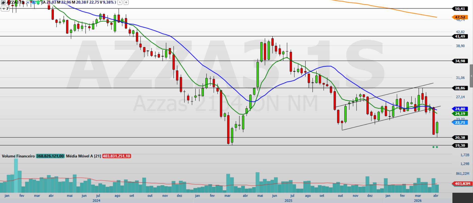 No médio prazo, a leitura segue mais cautelosa. A Azzas 2154 mantém uma estrutura de baixa no gráfico semanal, marcada por topos e fundos descendentes e pelas médias de 9 e 21 períodos inclinadas para baixo. Após um forte movimento vendedor, o ativo testou a região de R$ 20,38 e agora ensaia um repique, que até o momento interpreto como uma correção técnica dentro de uma estrutura ainda fragilizada.