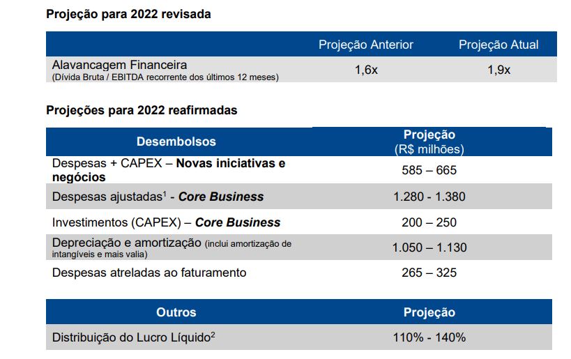 A B3 ainda reapresentou suas projeções para 2022 em função dos impactos do cenário econômico nos resultados da companhia, com revisão da projeção de alavancagem financeira para o final do ano de até 1,6 vez para até 1,9 vez a relação entre dívida bruta e Ebitda recorrente dos últimos 12 meses.