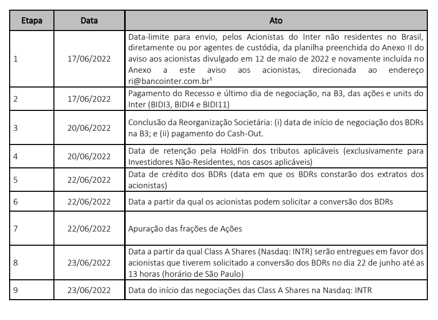 O banco explicou em comunicado que a partir de 22 de junho de 2022 os acionistas que tiverem recebido BDRs poderão, a qualquer tempo, solicitar a conversão dos BDRs de sua titularidade em Class A Shares de emissão de Inter & Co (INTR) nos EUA. Isto mediante instrução à sua instituição custodiante para que esta solicite ao Banco Bradesco, instituição depositária do programa de BDRs do Inter, a respectiva conversão.