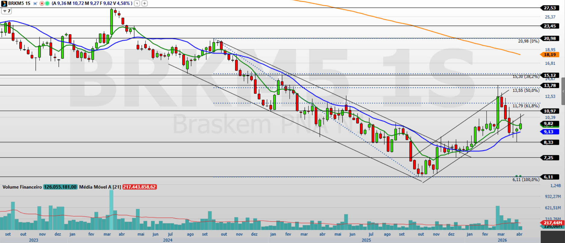 No médio prazo, a Braskem ainda apresenta um movimento de recuperação em 2026, mas inserido dentro de uma estrutura macro de baixa, o que sugere que o avanço recente pode ser interpretado como correção dentro da tendência principal. Após testar R$ 13,78, o ativo entrou em realização e agora busca estabilização próximo de R$ 9,82, ainda acima das médias de 9 e 21 períodos, sinalizando tentativa de formação de base. O IFR (14) em 53,52 reforça um cenário neutro.