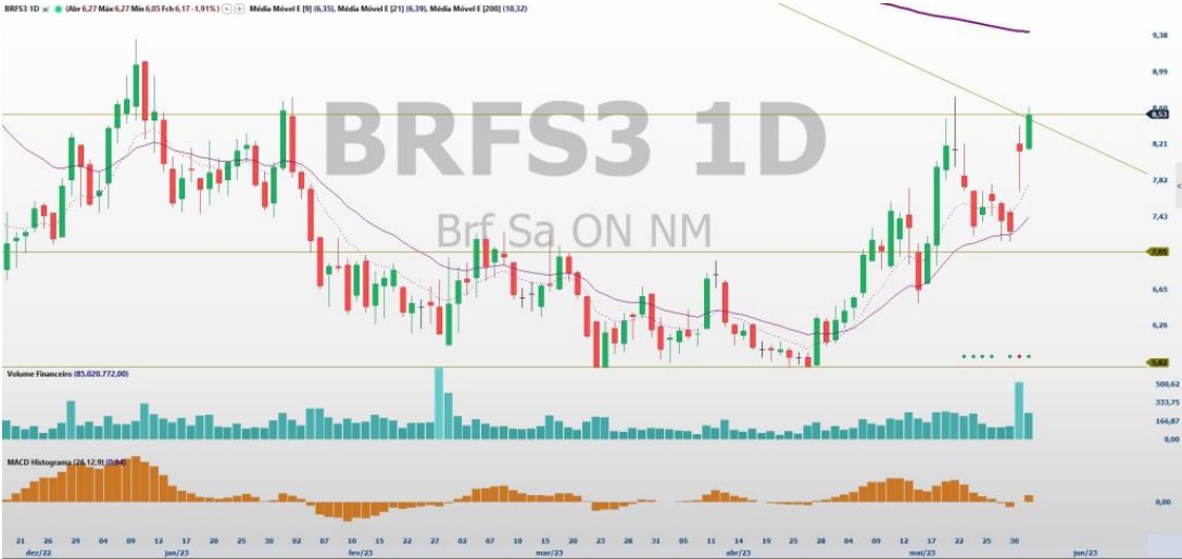 Conforme ele, vale ressaltar que a região de R$ 9,34, além de ser uma linha de preço considerada como resistência, também conta com uma MME200 (Média Móvel de 200 períodos) descendente, “o que poderá também servir como resistência dentro dessa mesma região de preço.”