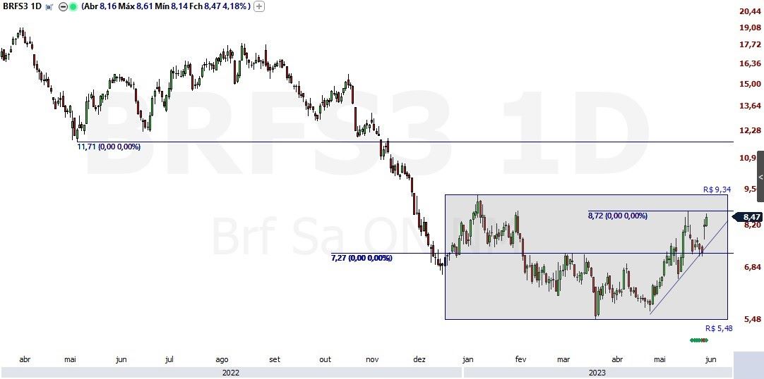 Para a Levante, os preços de suporte de BRFS3 são R$ 7,00 (1) e R$ 5,80 (2), ao passo que as resistência encontram-se em R$ 8,50 (1) e R$ 9,50 (2).