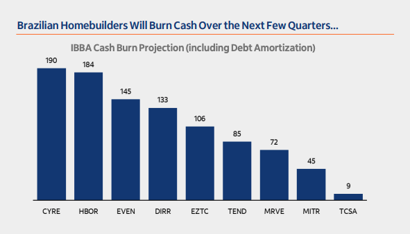 Em extenso relatório sobre o setor, o Itaú BBA estima que as companhias dentro da sua cobertura queimarão, juntas, R$ 969 milhões de caixa apenas durante o segundo trimestre de 2020. O BBA tem cobertura para Mitre, Eztec, Cyrela, Even, Tecnisa, Helbor, MRV, Tenda e Direcional.