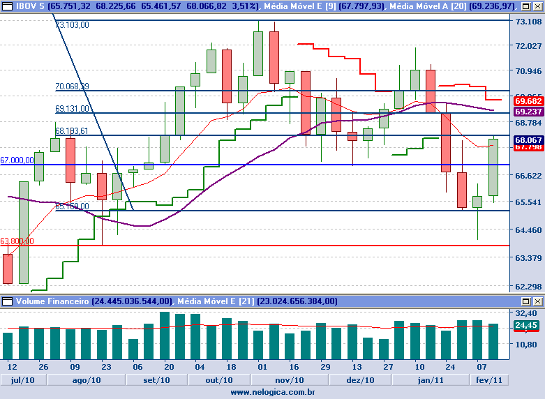 Com alta de 3,51%, o Ibovespa encerrou a última semana com viés positivo, afirma Cayre, acima da importante resistência – agora suporte – localizada na região dos 67 mil pontos. Com a retomada, o mercado enfrenta agora as retrações de Fibonacci da última perna de baixa, com principal objetivo nos 70 mil pontos.