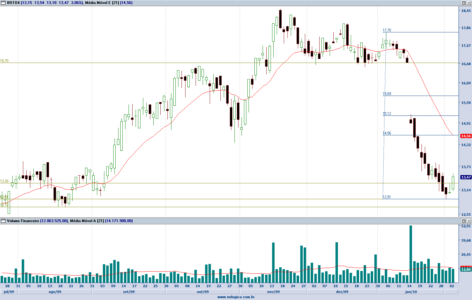 A forte baixa dos papéis preferenciais da Brasil Telecom (BRTO4), ante o gap feito na região dos R$ 16,70, pode ser uma boa oportunidade no curto prazo, avalia Santos, tendo em vista a formação de um fundo nos R$ 12,90. Deste modo, o ponto de entrada fica próximo da faixa entre R$ 13,30/R$13,50, com bom potencial de valorização em função dos objetivos das retrações de Fibonacci.
