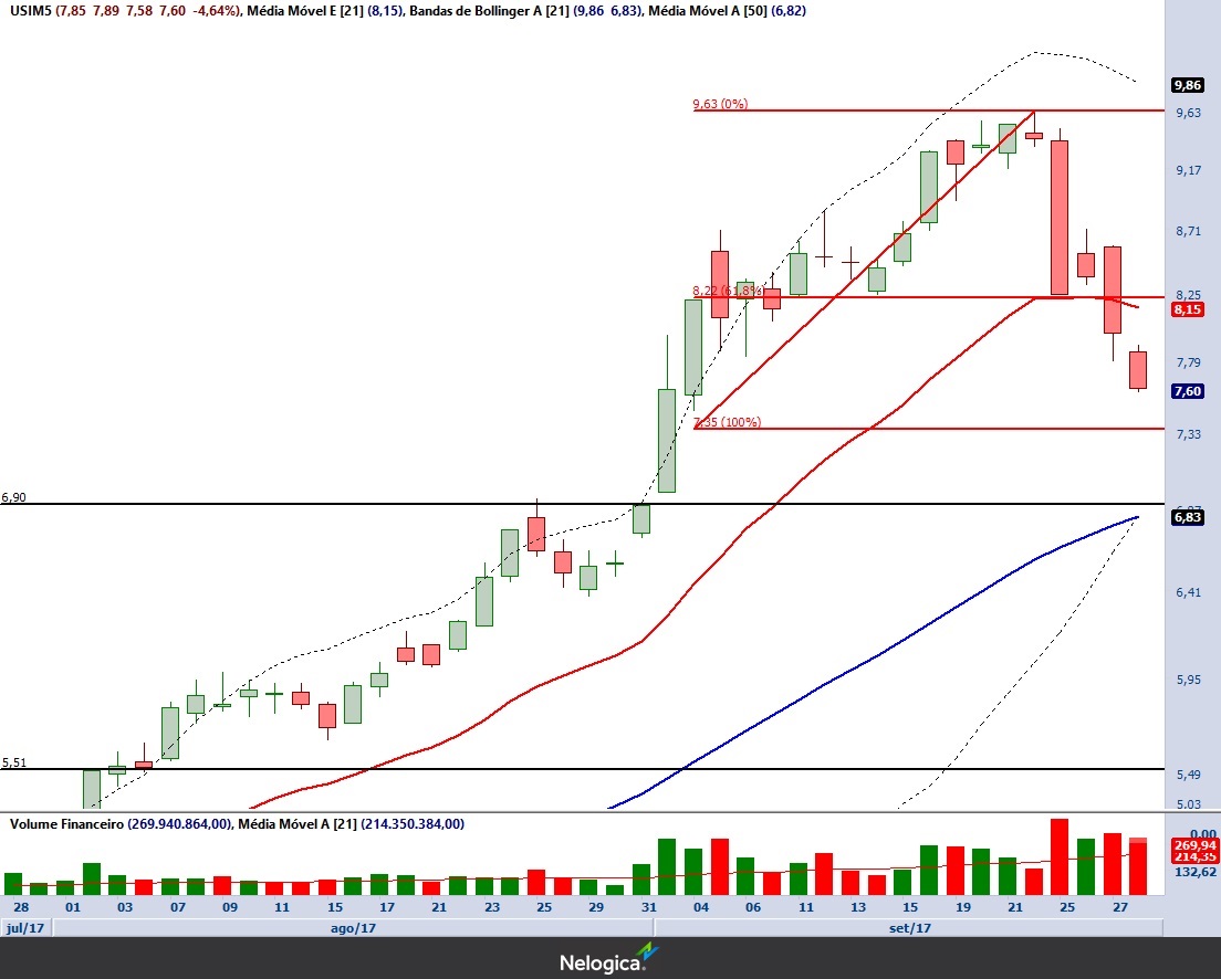 Nos últimos dias, as ações da Usiminas entraram no radar dos investidores por conta da forte queda, inclusive foram citadas no último InfoMoney na Bolsa edição de fechamento (veja a análise completa). Em termos gráficos, após a perda da média móvel exponencial de 21 dias, o papel sacramentou um pivô de baixa e tem como alvo R$ 7,35. Portanto, para quem está em busca de um ponto de entrada, o papel está bem próximo do seu objetivo.