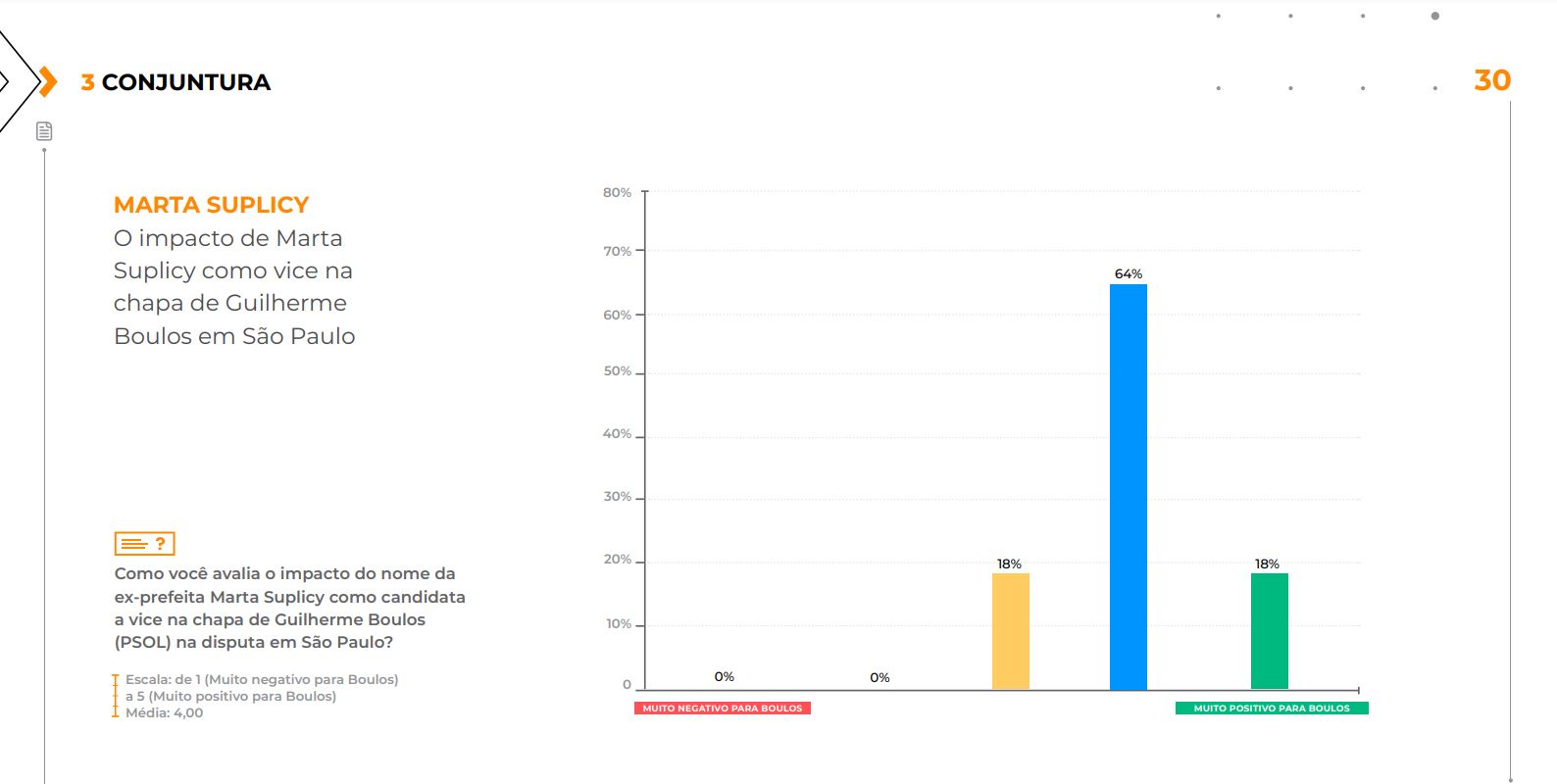 O estudo, realizado entre os dias 17 e 22 de janeiro, mostra que 18% dos entrevistados consideram o movimento “muito positivo” para a campanha de Boulos. E 64% avaliam como simplesmente “positivo”.