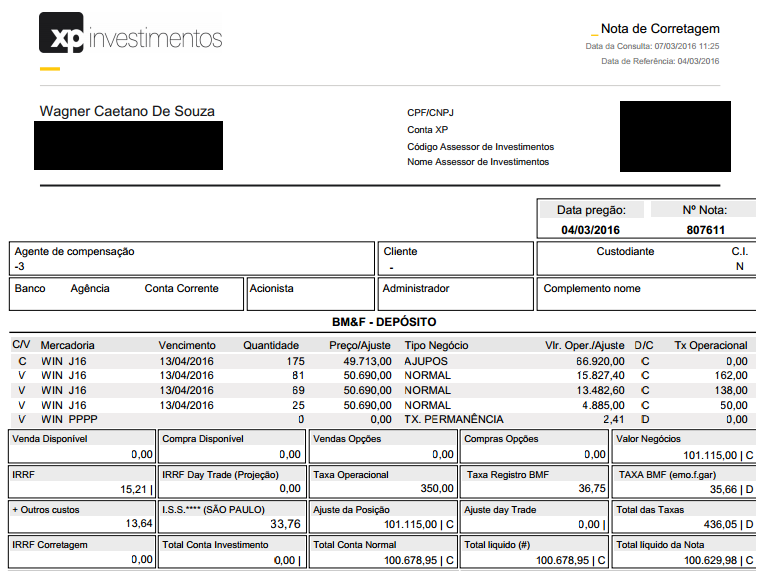 Foram 33 pregões de espera até finalizar sua operação. Na sexta-feira passada (4), Caetano encerrou todos os seus 175 contratos de mini-índice, conseguindo embolsar com a operação de R$ 350 mil. A comprovação da operação veio com a nota de corretagem, recebida nesta segunda-feira e que colocamos ao final desta matéria.