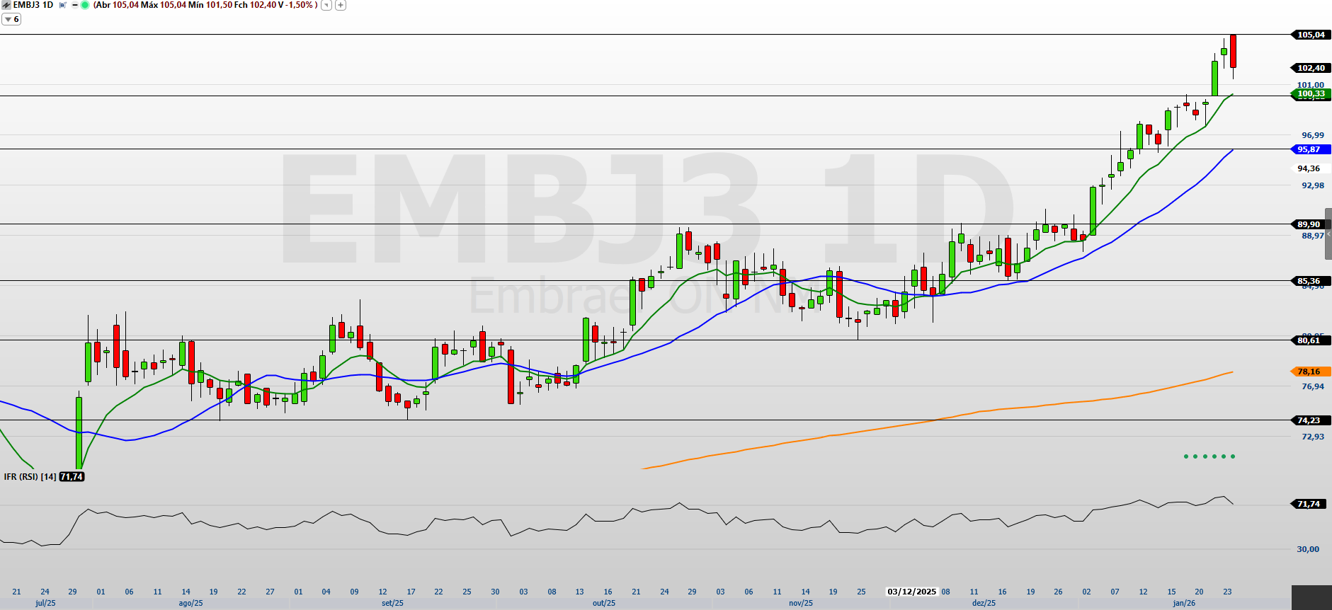 Pelo gráfico, EMBR3 negocia acima das médias móveis, que seguem inclinadas para cima, confirmando a tendência principal. Por outro lado, o preço encontra-se mais afastado dessas médias, caracterizando um movimento esticado. O IFR (14) em 73,59 aponta sobrecompra, o que aumenta a probabilidade de correções técnicas ou períodos de lateralização, movimentos naturais dentro de tendências fortes. Nesta semana, inclusive, o papel iniciou com viés levemente negativo, após três semanas consecutivas de alta, reforçando a necessidade de monitorar ajustes de curto prazo.