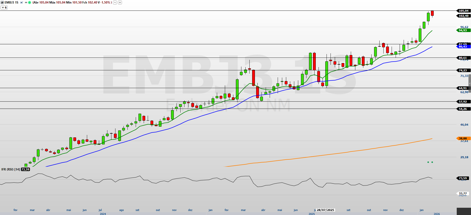 No médio prazo, a leitura técnica da Embraer permanece altista. O papel segue renovando máximas e sustentando o fluxo comprador, apoiado por uma estrutura técnica sólida e consistente. O desempenho acumulado reforça essa leitura, com alta de 15,58% em 2026, após ganhos de 58,21% em 2025 e 150,96% em 2024.