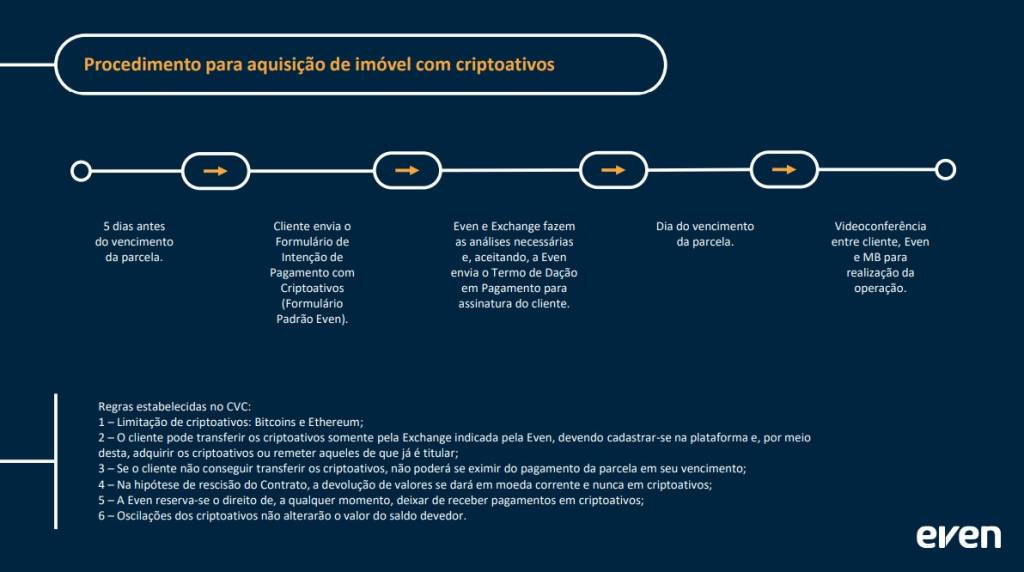 Em comunicado, a Even explicou como irá funcionar o procedimento para essa modalidade, com o cliente enviando um formulário de intenção de pagar com cripto cerca de cinco dias antes do vencimento da parcela. Em seguida a operação será feita pelo Mercado Bitcoin, que ainda fará uma videoconferência com o cliente para aprovar a operação. Confira abaixo: