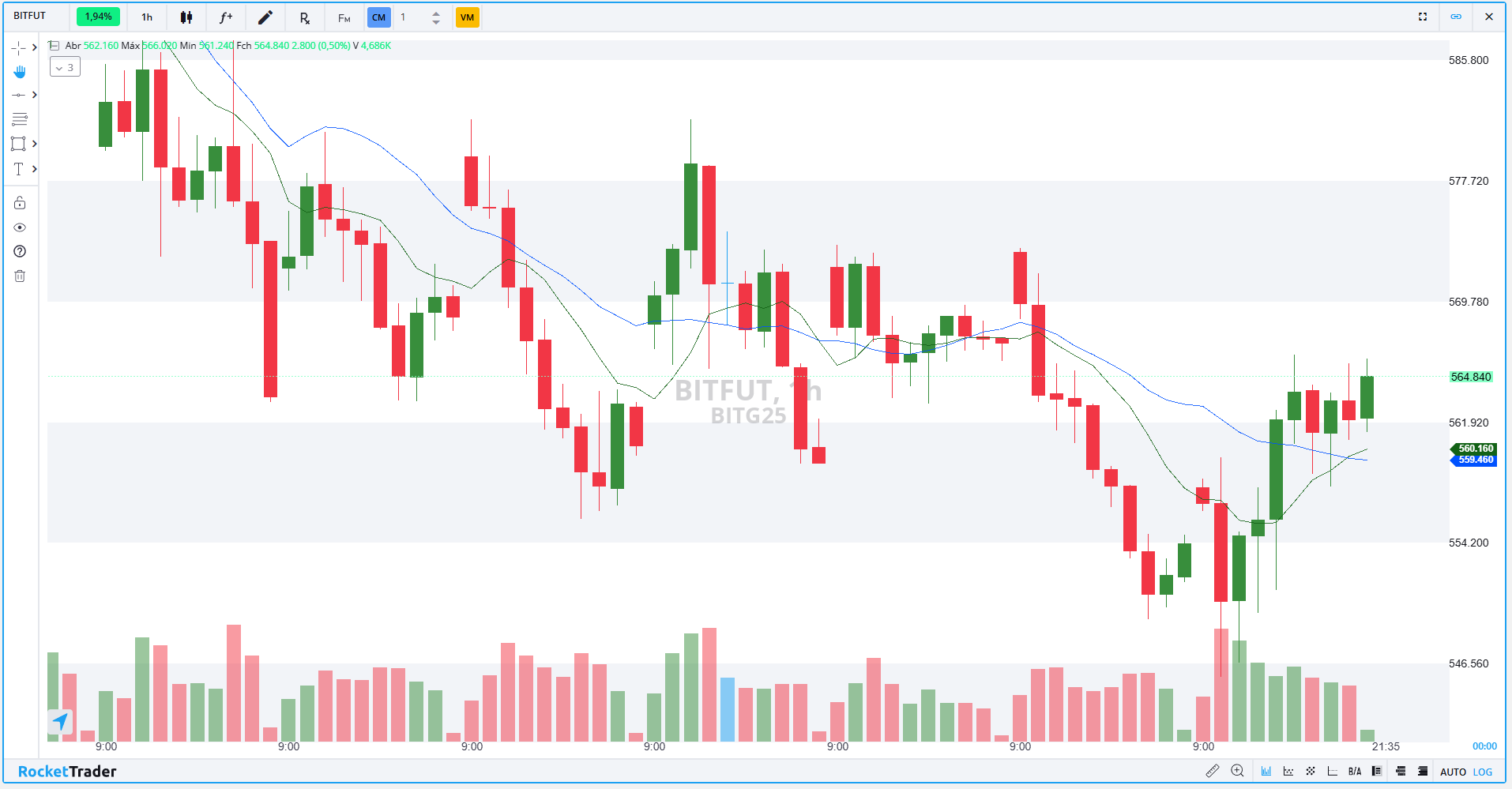 Os contratos futuros de Bitcoin (BITG25), com vencimento em março, encerraram a última sessão em alta de 1,94%, aos 564.840 pontos, mostrando força compradora após um período de correção. O ativo agora se aproxima de resistências importantes, o que pode definir a continuidade desse movimento.