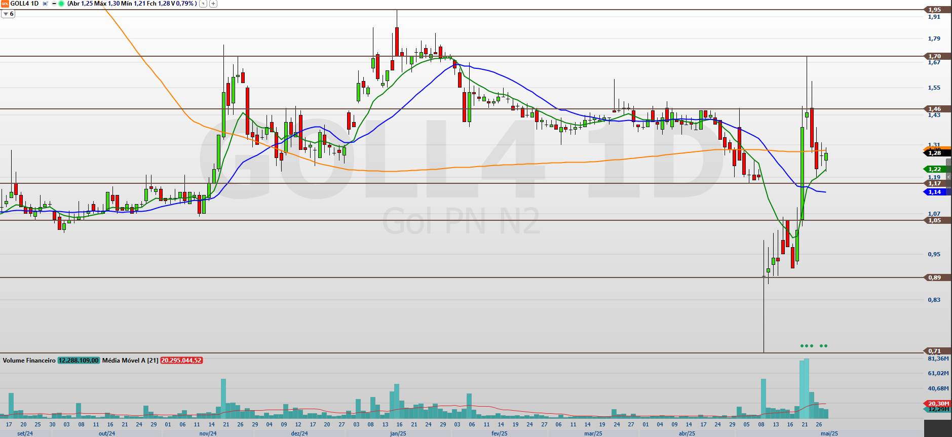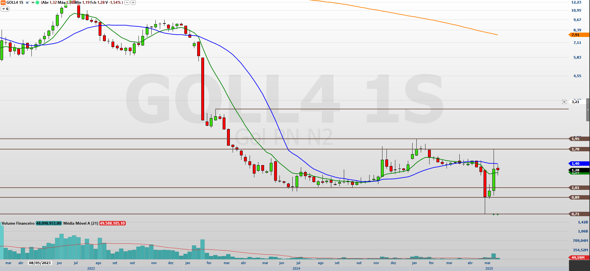 No gráfico diário, GOLL4 mostra uma trajetória de recuperação desde o teste da mínima histórica em R$ 0,71, com avanço até R$ 1,70, onde encontrou resistência e iniciou uma correção. Na última sessão, a ação fechou com alta de 0,79%, cotada a R$ 1,28, e agora testa a média de 200 períodos em R$ 1,29.