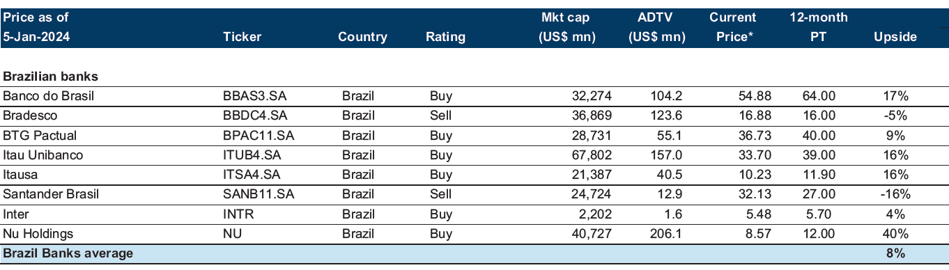 O Goldman Sachs segue otimista com os bancos brasileiros em 2024, dadas as tendências operacionais saudáveis e as avaliações ainda atrativas. “Os bancos no Brasil estão saindo de um ciclo de crédito, o que, juntamente com taxas mais baixas, deve beneficiar o crescimento do empréstimo”, comenta.