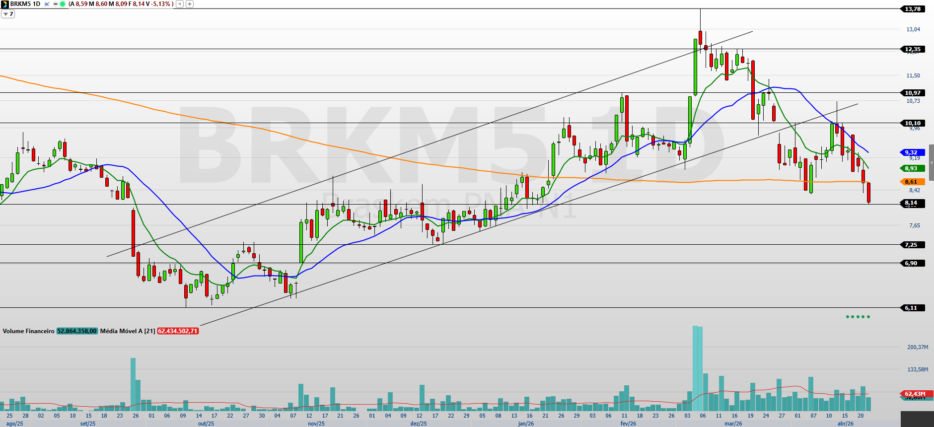 Liderando as baixas após o rali, com queda de 17,01%, a ação da Braskem (BRKM5) vinha estruturando um movimento de alta dentro de um canal ascendente, respeitando topos e fundos mais altos ao longo das últimas semanas.