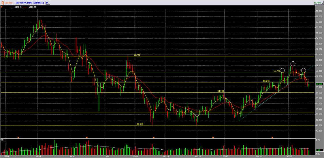 Vilares acredita que a perda do suporte em 55.300 pontos deixou a situação bem menos positiva para o mercado. Agora, esse nível, que era suporte, passa a ser resistência, e se em um próximo movimento de alta esse nível for superado, o mercado continuará em uma situação de indefinição. Mas, se não for superado nos próximos dias, a tendência será revertida para baixa.