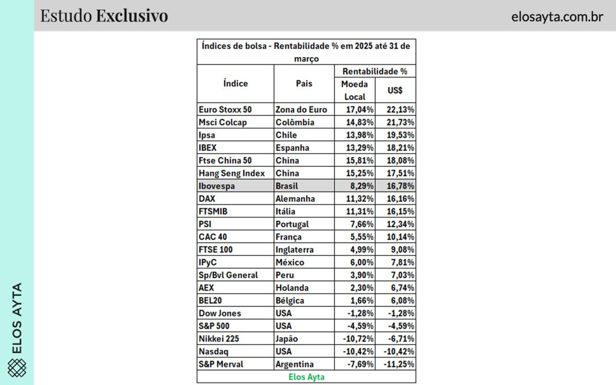 O Ibovespa, principal índice acionário do Brasil, fechou o primeiro trimestre de 2025 com uma rentabilidade de 16,78% em dólares, alcançando a sétima posição entre os 21 maiores índices globais analisados pela consultoria Elos Ayta. Em reais, a alta foi de 8,29%.