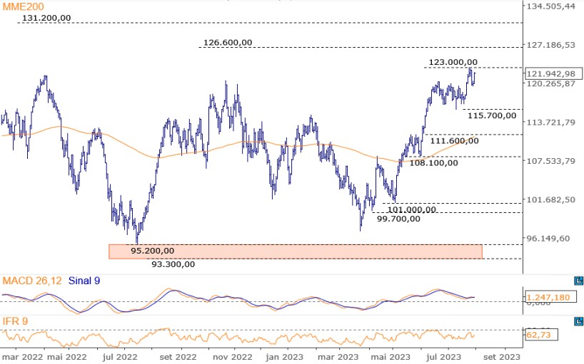Ibovespa fechou ontem com alta de 1,46%, aos 121.942,98 pontos