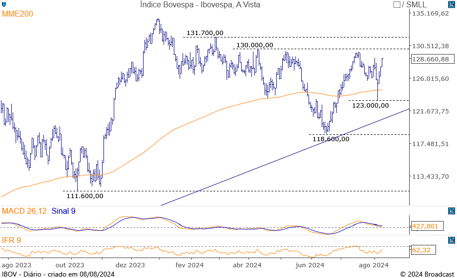 Ibovespa fecha preliminarmente com alta de 1,43%, aos 130.498,26 pontos
