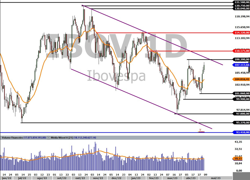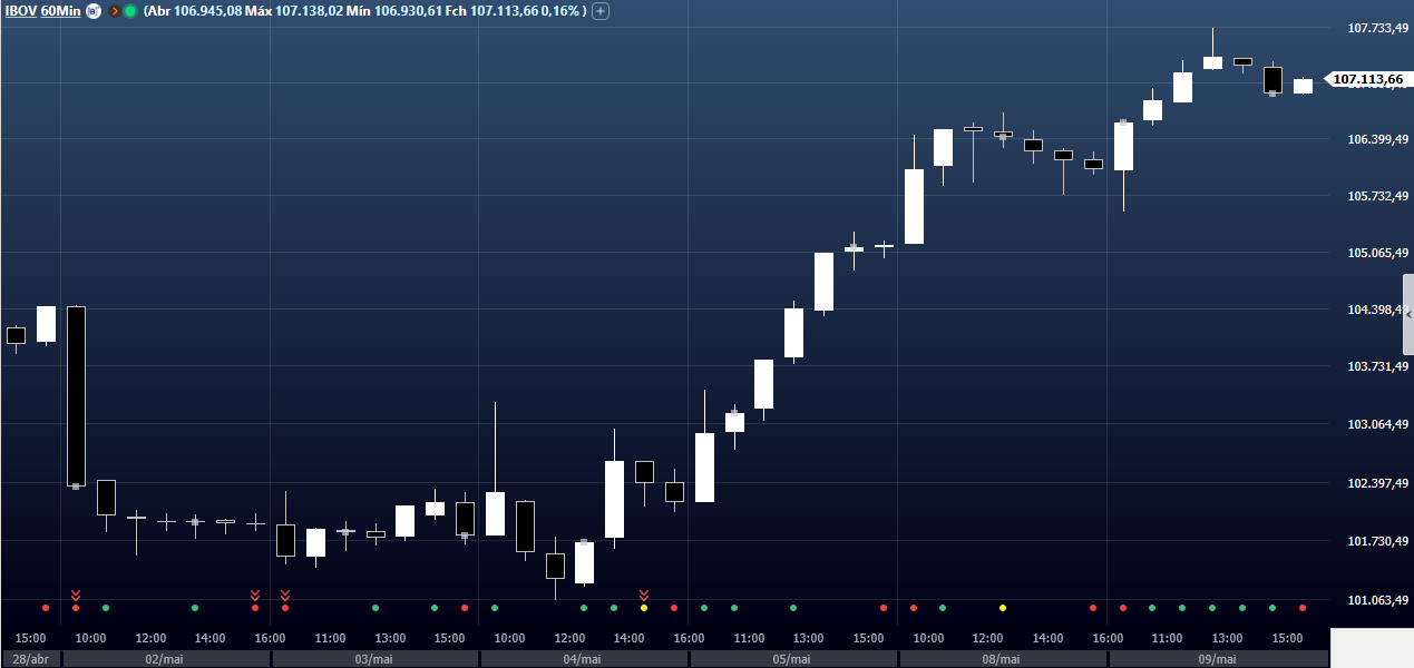 É a quarta alta seguida do Ibovespa e é o maior patamar que o índice fecha desde 23 de fevereiro de 2023, quando encerrou o dia com 107.592,87 pontos.