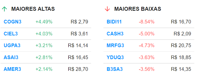 Do outro lado, entre as altas estão as ações da Cielo (CIEL3), com mais 4,61%, da Ultrapar (UGPA3), que sobe 2,85%, e as da Cogna (COGN3), com alta de 2,62%.