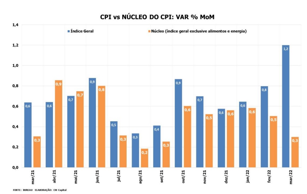 O indicador de destaque no continente europeu foi a inflação na Alemanha. Em março, o índice de preços ao consumidor subiu 7,3% na comparação anual – a maior variação em 40 anos. Na comparação com fevereiro, a inflação ao consumidor avançou 2,5%. A escalada global de preços tem reforçado o sentimento de aversão ao risco do investidor e a perspectiva de que os Bancos Centrais devem adotar posturas mais agressivas para conter a inflação.