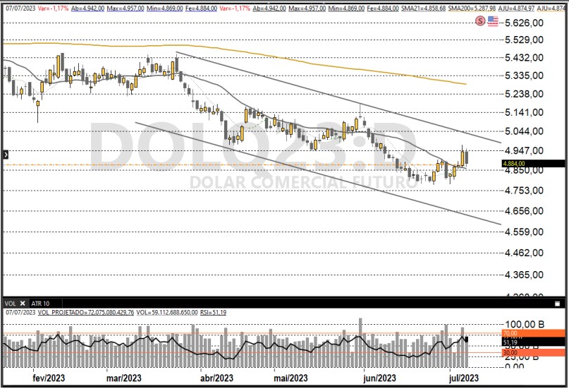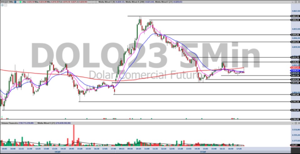 Ibovespa Futuro fecha com queda de 0,51%, aos 118.975 pontos; e dólar futuro, com alta de 0,11%, a R$ 4,8250