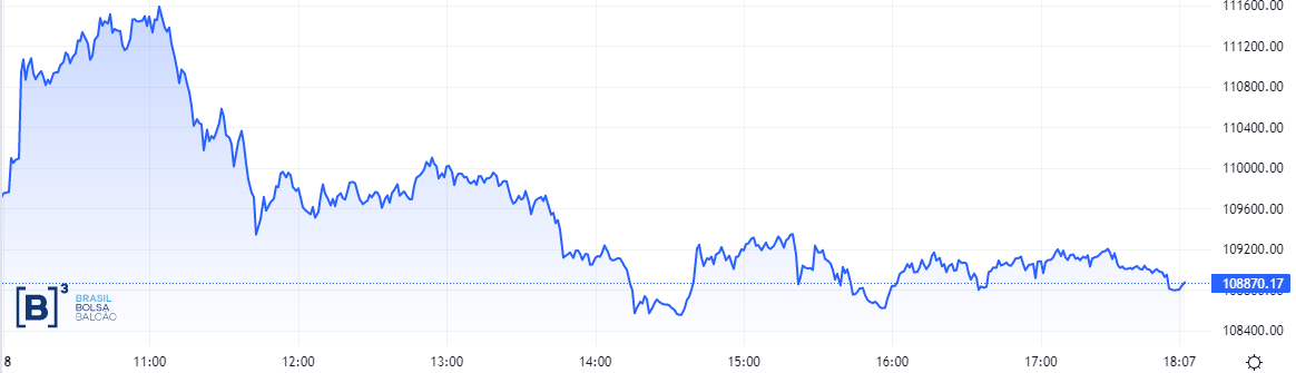 Ibovespa fecha, preliminarmente, com queda de 0,82%, aos 108.799,28 pontos