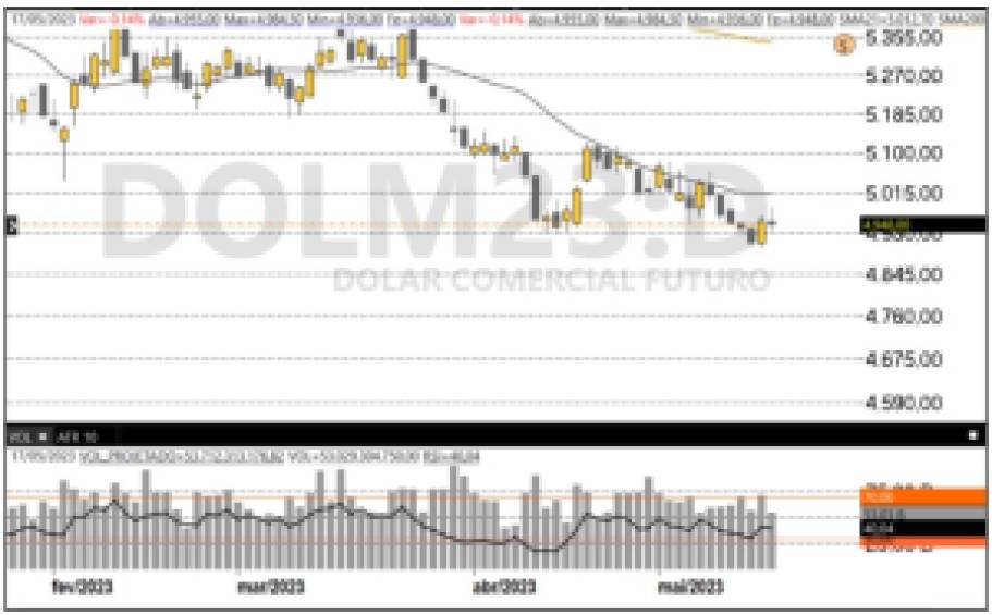 O dólar voltou a se valorizar frente ao real, em movimento que vai na direção da moeda norte-americana pelo mundo: o índice DXY ficou com mais 0,62%. O dólar passou o dia em alta, com os Treasuries nos EUA se recuperando, após notícias de que o acordo sobre o teto da dívida está estruturado.