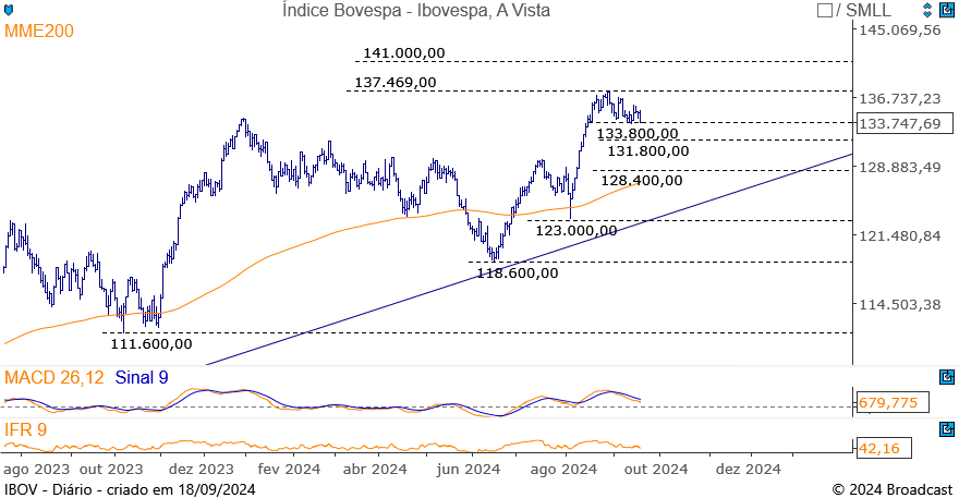 Mini-índice (WINV24) pode seguir em baixa se romper suporte nos 134.450 pontos