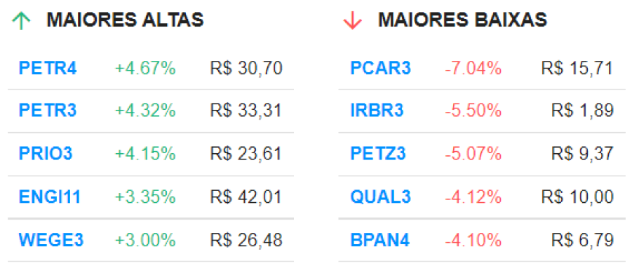 Assim, os papéis da Petrobras lideraram os ganhos com altas superiores a 4%, tanto de suas ações preferenciais quanto ordinárias, seguidos por Petrorio e 3R Petroleum (RRRP3), com mais 2,8%.
