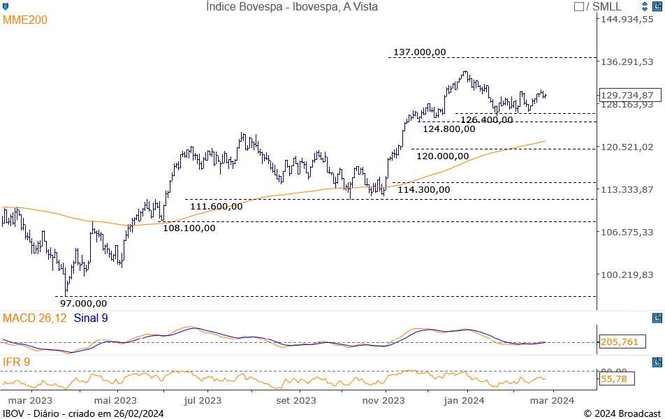 | Ativo | Dia (%) | Pontos | Variação (pts) | Negócios | Semana (%) | Fevereiro (%) | 2024 (%) | |