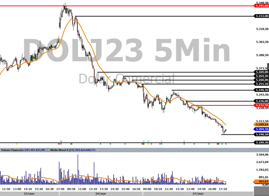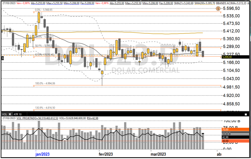 O dólar segue com tendência de baixa e se desvalorizou com amplitude pela terceira sessão seguida diante do real, seguindo o índice DXY, que ficou em queda de 0,46%. O câmbio em queda também veio em razão da possibilidade do país finalmente conhecer o formato do novo arcabouço fiscal: o ministro da Fazenda, Fernando Haddad, disse que o anúncio pode acontecer esta semana.