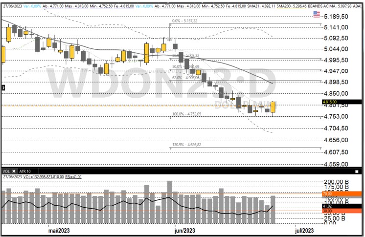 Por aqui, o Banco Central vai divulgar as estatísticas de crédito de maio, enquanto o Tesouro divulgará relatório da dívida pública federal de maio. Na seara política, o ministro Benedito Gonçalves, do TSE, votou na terça-feira (27) pela condenação do ex-presidente Jair Bolsonaro à inelegibilidade por oito anos. Após o posicionamento do relator, o julgamento foi suspenso e será retomado na próxima quinta-feira (29).
