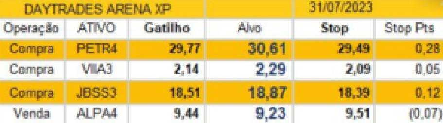 | Ativo | Julho (%) | Dia (%) | Valor (R$) | Semana (%) | 2023 (%) | |