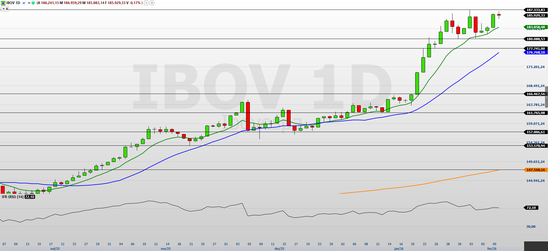Em 2026, o IBOV já avança 15,39%, negociando próximo dos 185.929 pontos, muito perto da máxima histórica em 187.333 pontos. Os preços seguem acima das médias móveis de 9 e 21 períodos, sustentando a estrutura altista no médio prazo.