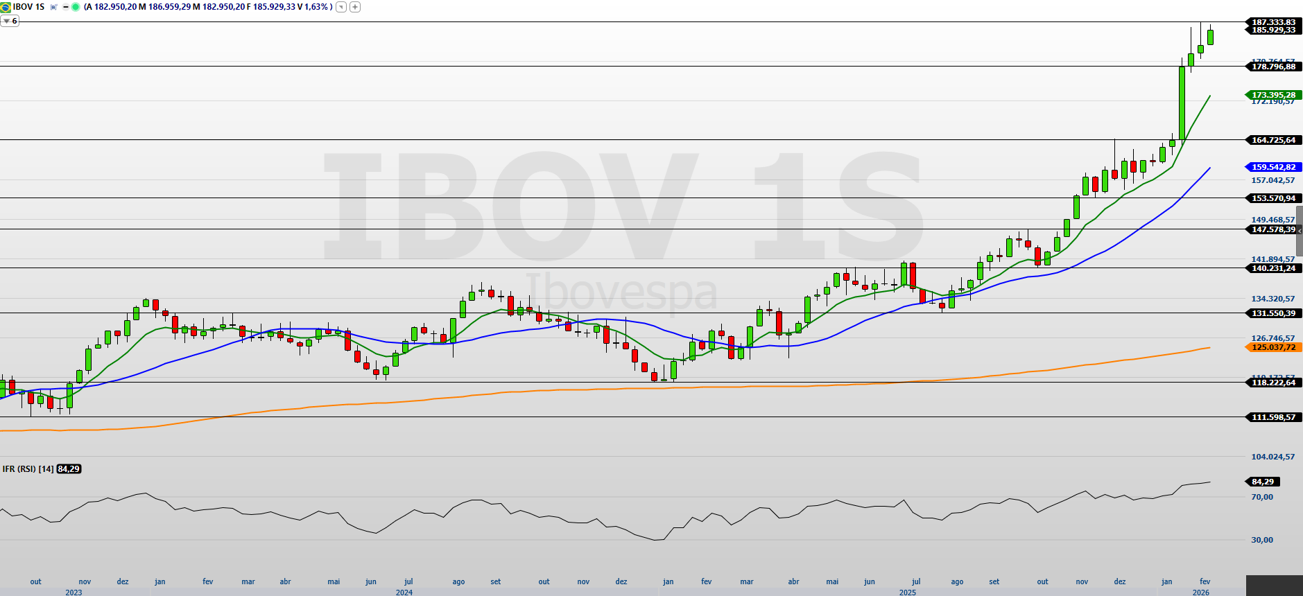 No curto prazo, observo um mercado forte, sustentado acima dos 180 mil pontos, porém já em condição técnica mais esticada. O IFR (14) no gráfico diário marca 72,10, em região de sobrecompra, enquanto no semanal o indicador avança para 84,29, reforçando o alerta para possíveis correções técnicas ou realizações pontuais.