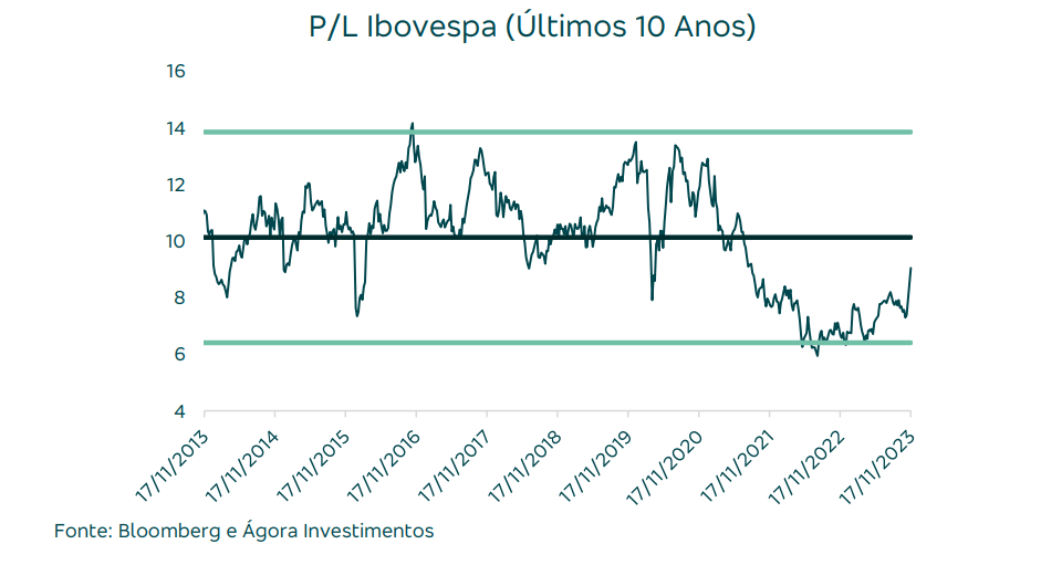 Para a equipe de análise da Ágora, o Ibovespa continua sendo negociado com um valuation atraente, devido aos riscos negativos de cauda, relacionados tanto com fatores externos (por exemplo, política monetária nos EUA e Europa e riscos geopolíticos), como internos (por exemplo, ajuste fiscal). Portanto, a evolução destes riscos continuará sendo preponderante para os preços dos ativos.