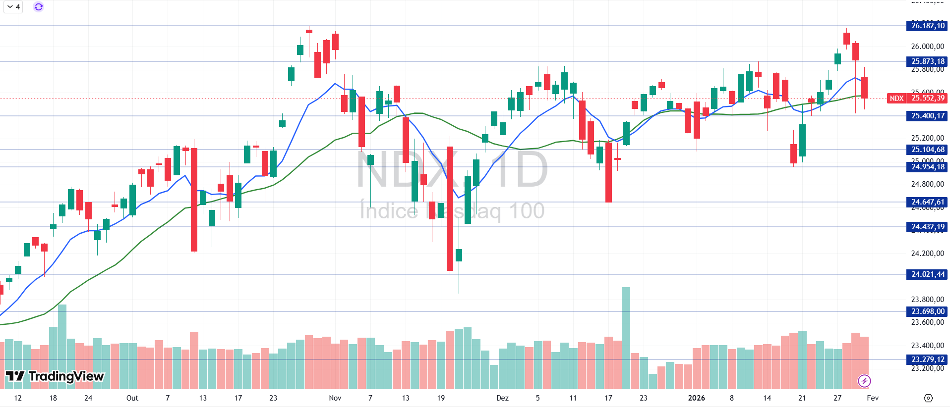 Para que a Nasdaq volte a ganhar tração altista, será necessário superar 25.873 pontos e, na sequência, romper a máxima histórica em 26.182 pontos, abrindo espaço para projeções em 26.475/26.735.