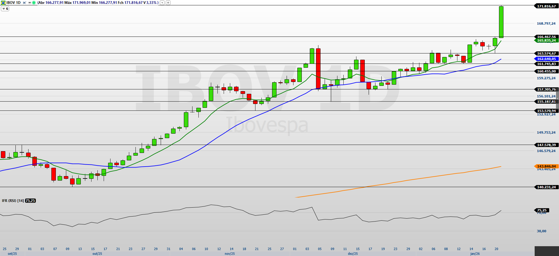 No curto prazo, observo o Ibovespa em forte tendência de alta, com aceleração relevante nas últimas sessões. O fechamento em 171.816 pontos, após tocar a máxima histórica em 171.969 pontos, reforça a dominância do fluxo comprador e mantém o índice em condição técnica favorável para extensão das altas.