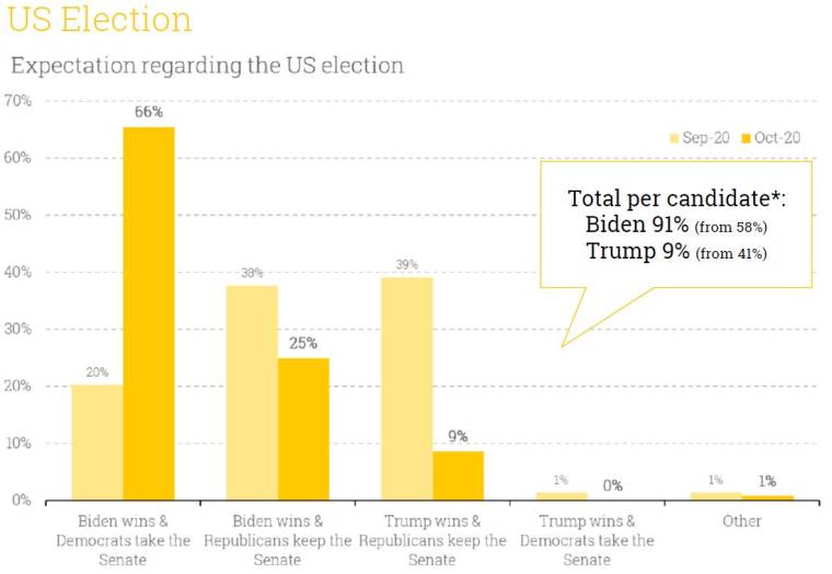 Em um mês, cresceu de 20% para 66% o grupo dos que acreditam que o democrata sairá vitorioso do pleito e seu partido ainda conquistará maioria no Senado. Outros 25% apostam em vitória de Biden, mas veem uma tendência de os republicanos manterem o controle sobre a casa legislativa.