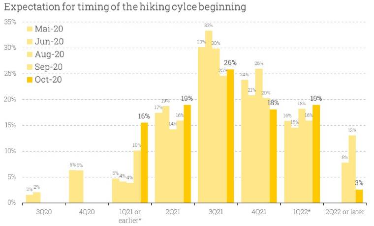 Há, contudo, divergências quanto ao momento em que se iniciará um novo ciclo de alta dos juros no país. A sondagem mostra que a maioria dos consultados (44%) aponta para o segundo semestre de 2021. Apesar de majoritário, o grupo diminuiu em relação a agosto: 56%.