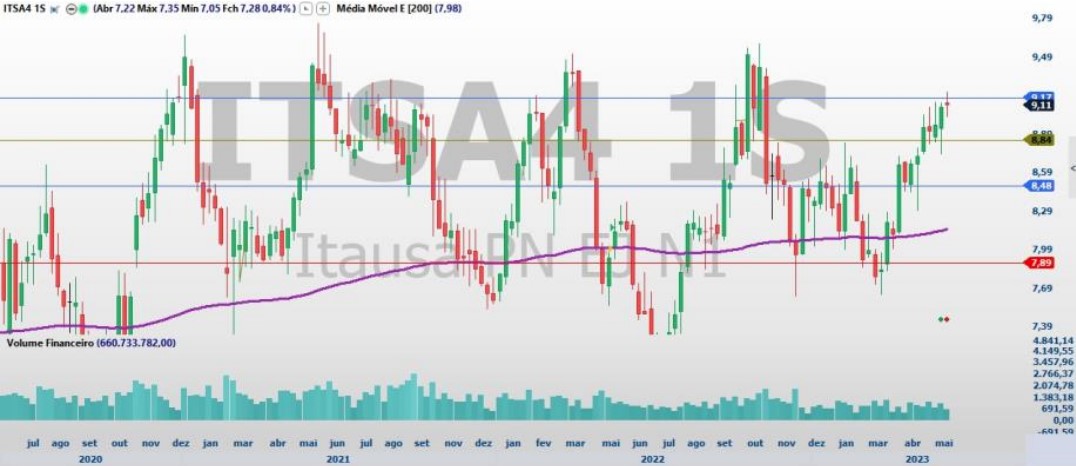 “No curto prazo, houve um movimento de recuperação dos preços, levando a Itaúsa a se aproximar da zona de resistência, junto com um aumento significativo no volume financeiro. Essa movimentação também foi observada em outros papéis do mesmo setor, que registraram um aumento no volume financeiro e uma recuperação dos preços, alcançando níveis importantes de resistência”, avalia.