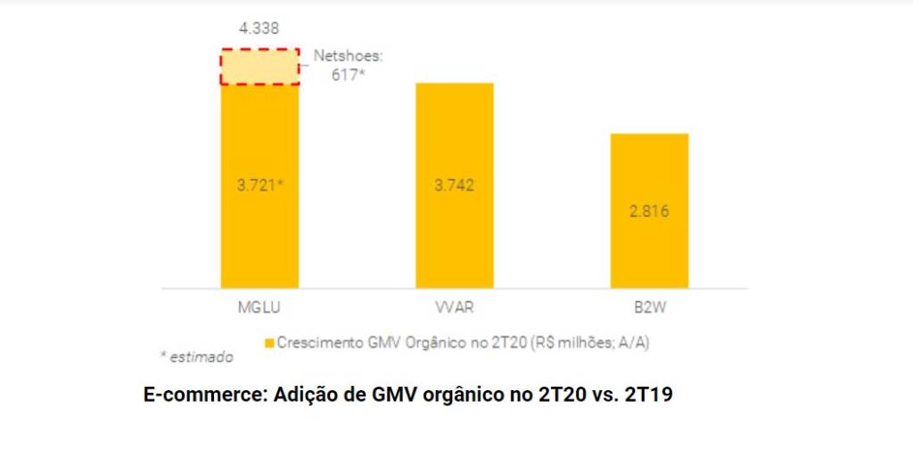 Para o Itaú BBA, por sinal, o Magalu foi a companhia que se destacou entre as brasileiras, sendo capaz de entregar um crescimento de receita líquida (de 29,3%, a R$ 5,57 bilhões), apesar do fechamento de grande parte de suas lojas durante a maior parte do trimestre. Além disso, os dados iniciais de julho sugerem que o crescimento do e-commerce segue forte: a companhia iniciou o terceiro trimestre com sólido crescimento de 82% nas vendas totais em julho na base anual, impulsionadas pela retomada do crescimento de 10% em lojas físicas e 162% no e-commerce (já considerando a Netshoes na base de comparação).