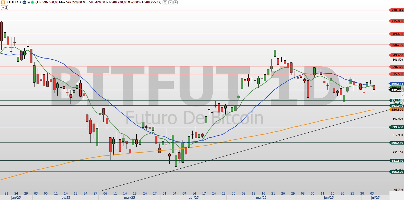 Os contratos futuros de Bitcoin (BITN25), com vencimento em julho, encerraram a última sessão em queda de 2,00%, cotados a 589.220 pontos.
