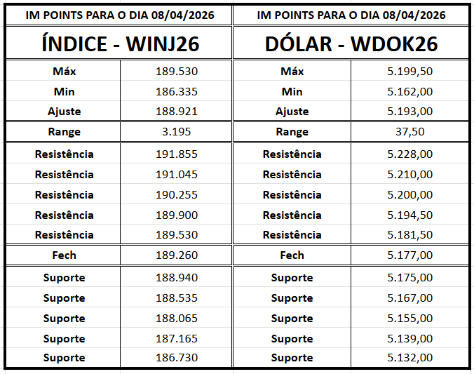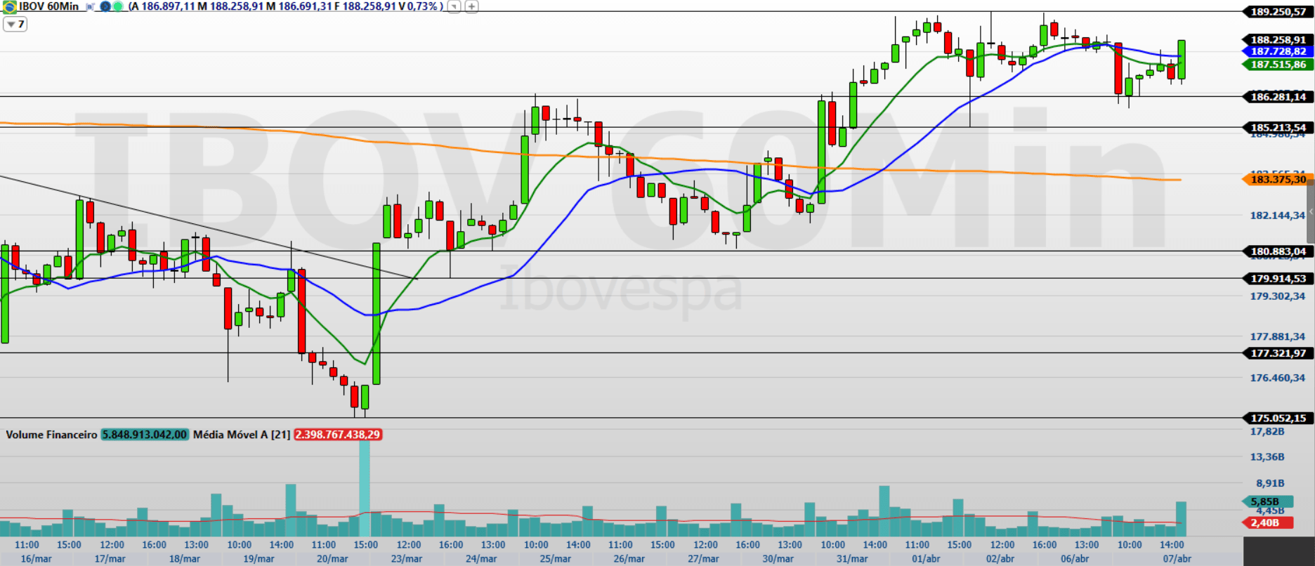 O mini-índice (WINJ26) encerrou a última sessão (07/04) em alta de 0,36%, aos 188.260 pontos, mantendo o viés positivo no curtíssimo prazo.