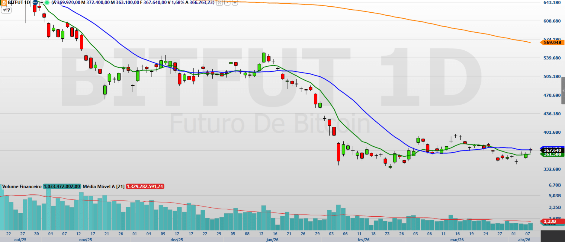 Acompanhei mais uma sessão de valorização no futuro de Bitcoin (BITJ26), com vencimento em abril. O contrato encerrou o último pregão em alta de 1,68%, aos 367.640 pontos, marcando a terceira alta consecutiva e reforçando o fluxo comprador no curtíssimo prazo.