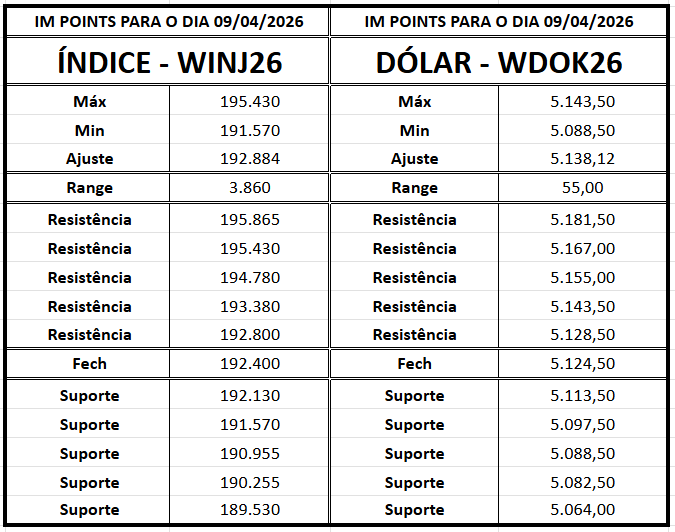 O mini-índice (WINJ26) encerrou a última sessão (08/04) em forte alta de 1,91%, aos 192.400 pontos, em um movimento expressivo, embora com devolução parcial ao longo do dia.