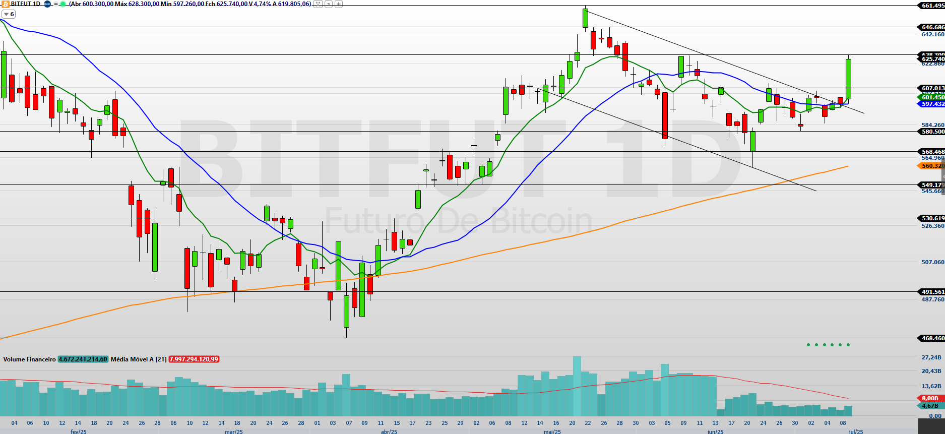 Os contratos de Bitcoin (BITN25), com vencimento em julho, encerraram a última sessão com uma forte alta de 4,74%, aos 625.740 pontos. O movimento veio acompanhado de um expressivo candle comprador e marca a retomada acima das médias de curto prazo, sinalizando possível reativação da força compradora.