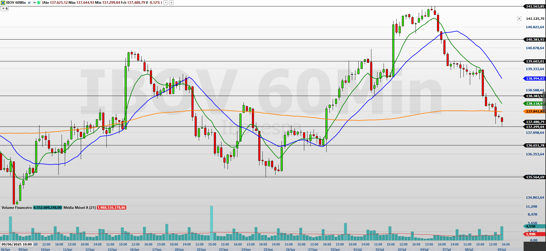 No intradiário, o Ibovespa seguiu pressionado e encerrou o dia negociando abaixo das médias de 9, 21 e 200 períodos. A resistência imediata está na faixa de 137.840/139.000 pontos, que precisa ser superada para sinalizar retomada da força compradora. Caso isso ocorra, os alvos passam para 139.600/140.380 e, mais acima, o topo histórico em 141.563 pontos.